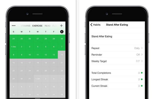 Momentum正是通过这样的提醒和数据,给予用户成就感和坚持的动力。日历视图的大片绿色,加上「连击」数据,相信能够让用户成就感十足。当然,「跳过」的日子不会打断「连击」。